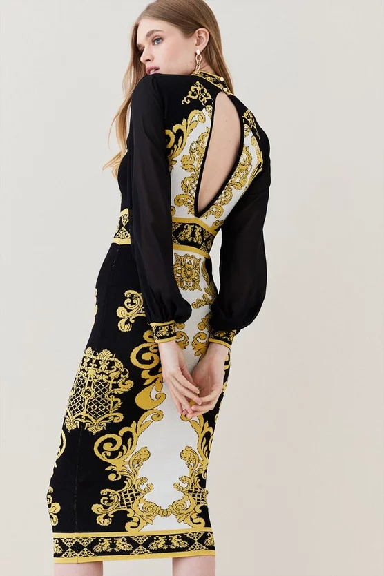 A curve-sculpting style with a regal twist. This jacquard knit midi dress boasts a bold Baroque print offset by voluminous mesh sleeves and comes cut high to the neck for a modern finish. Skimming the figure in all the most flattering places, it reveals an open back cut-out to show off a sophisticated sliver of skin.