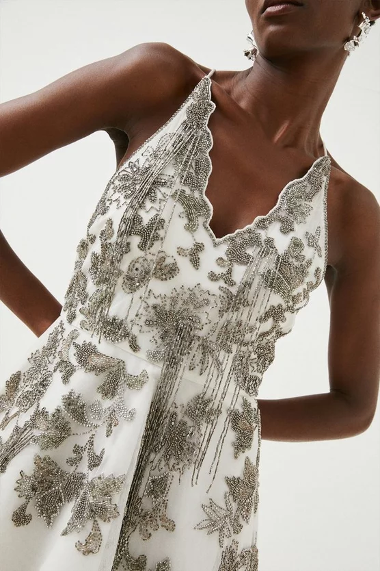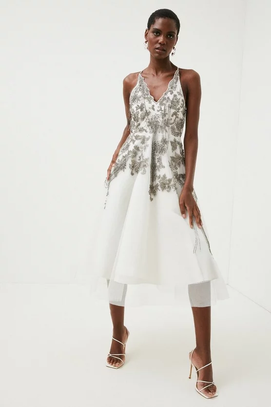 This special dress was created for a memorable occasion. Expertly crafted with soft folds of sheer white chiffon over a mid-length circle skirt, and attached to a fitted bodice. Antique gold beads adorn the top in an ornate floral design with waterfall strings draping down the body. The neckline and back cutout are finished with scalloped edges, and the high neckline is framed by narrow shoulder straps.