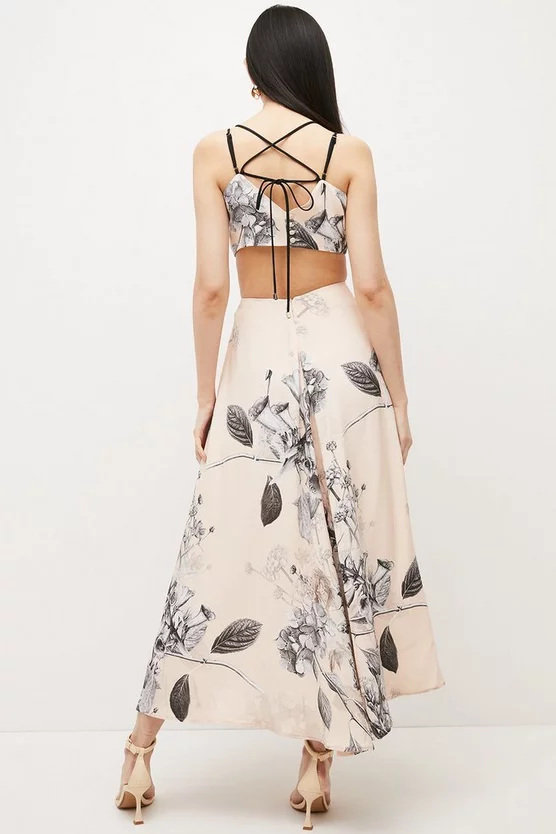 One for modern maximalists, this opulently printed maxi dress blooms with an exquisite hydrangea print. The romantic blush-pink tone feels just right for summer soirees, whilst black piped details add a hint of contemporary freshness. With its architectural cut-outs and crossover tie straps, this flowing design breathes new life into any after-dark repertoire.