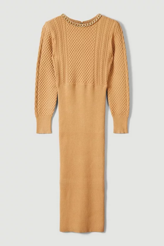 Take your knitwear to the next level with this cable-knitted midi dress. Showing off a chain detailed neckline, fitted silhouette and a captivating open back, this will ensure you have all eyes on you. Pair it with heeled boots for an extra sophisticated look.
