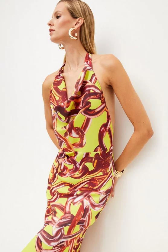 Fluid folds of crepe define this 90’s-inspired piece, which drapes the frame with a streetwear-imbued chain print. It has a cowl neckline that secures with a cascading halter tie that suspends down the rear with dramatic, languid appeal. Featuring a low back and ruched waistband that defines the waist, it lands at a maxi-length skirt with split hem detailing.