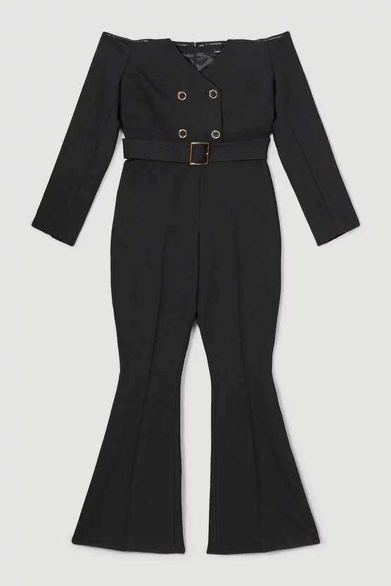 Achieve effortless elegance in this tailored Bardot jumpsuit. Cut with sharp angles, this piece gives an instantly polished aesthetic that would suit both desk and dancefloor. Glossy double-breasted buttons and a buckle belt detail add dimension to the jumpsuit, while flared trousers help to create an hourglass silhouette.