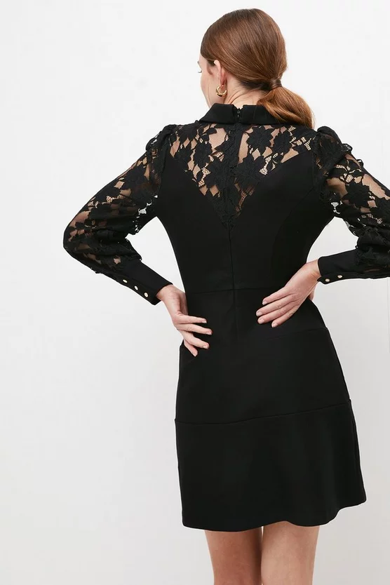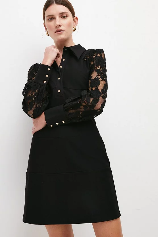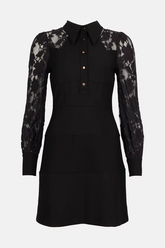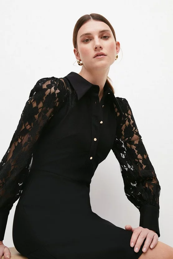 Give in to the gothic glamour of this smart LBD. Detailed with neat buttons and luxurious lace sleeves, this collared design lends the perfect amount of polish to any occasion.