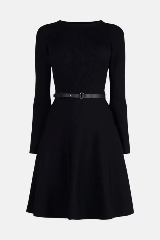 The perfect style solution for what-to-wear moments, this sleek knitted skater dress offers instant refinement. It features a feminine flared skirt, long sleeves and a contrasting slimline waist belt to gently define your curves.
