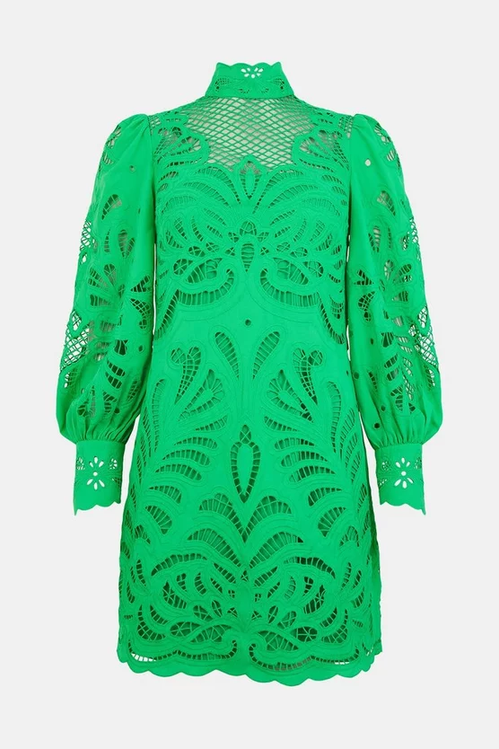 Nodding to the opulence of another era, this sumptuously crafted mini dress comes detailed with fine cutwork and scalloped trims. Accentuate its softly puffed sleeves, artisanal details and delicately buttoned cuffs with strappy heels for sunset cocktails.