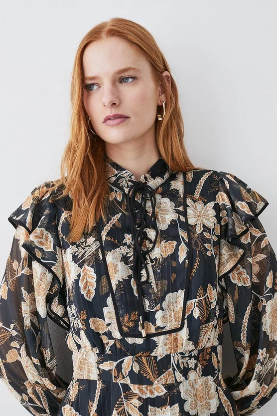 Cheapest โญ Karen Millen Metallic Guipure Lace Placed Floral Pleat Midi ๐ Dress – black โจ