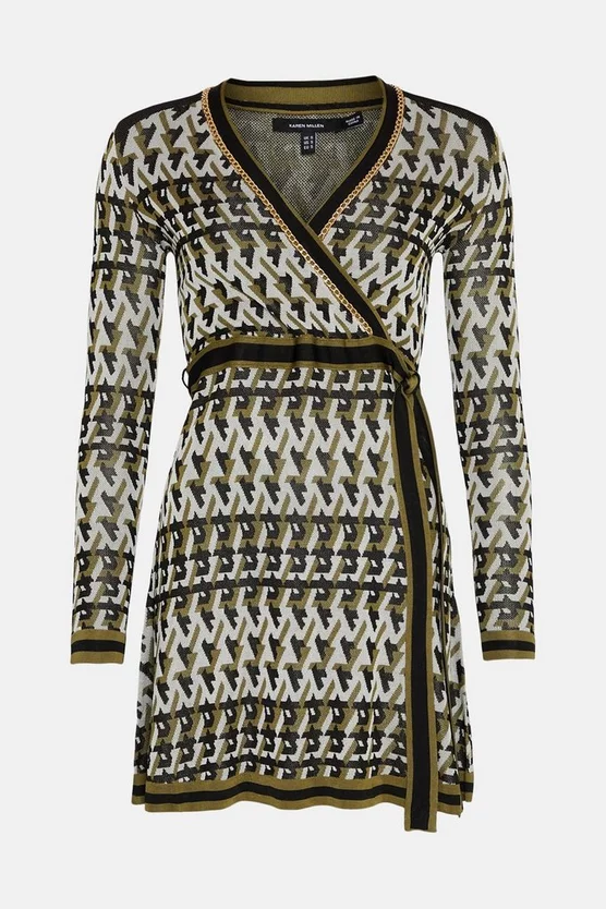 The wrap dress, reimagined. Defined by its retina-popping geometric motif and sultry mini skirt, this sleek dress breathes Sixties-inspired style into your wardrobe. Glossy chain-link embellishments line the wrap-over neckline, accentuating sporty striped trims and a waist-defining belt.