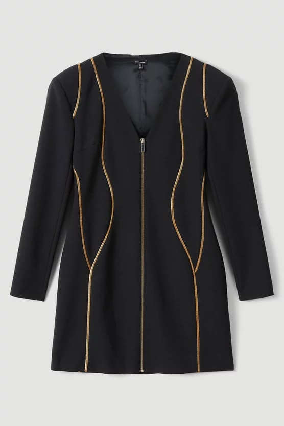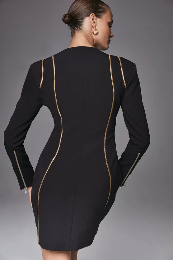 Add a directional spin to your ensemble with this gold trim mini dress. Accentuated with strong shoulders and full-body zip closure, this piece was designed to make a statement.