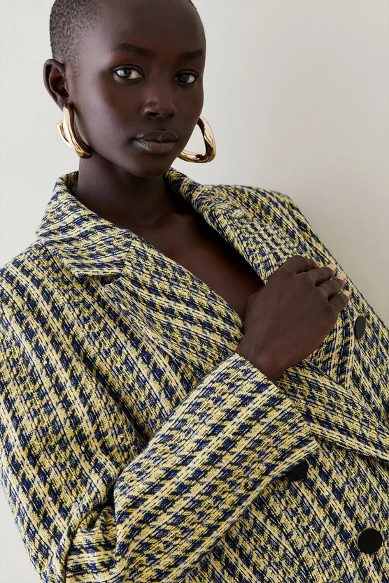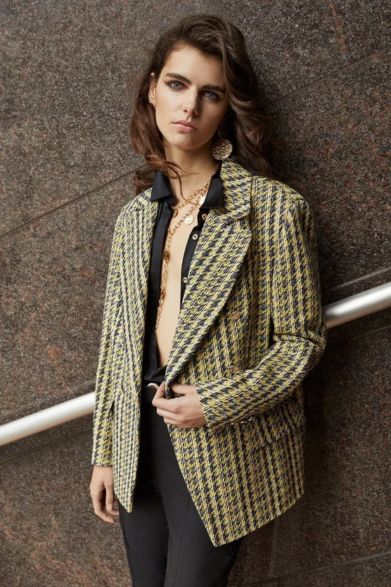 Embrace traditional tailoring with this heritage tweed blazer. Accented with brass buttons, jetted pockets and a double-breasted lapel collar, this garment exudes timeless elegance. Layer on top of an all-black ensemble to make a truly striking impact.