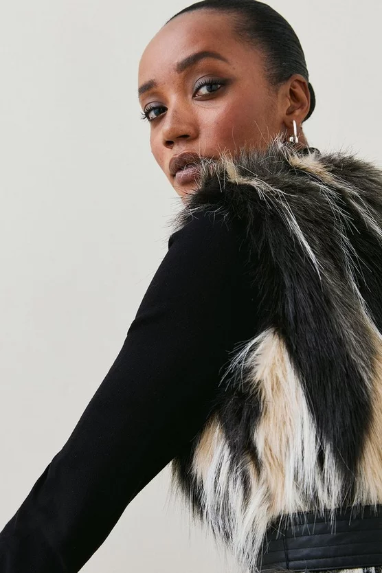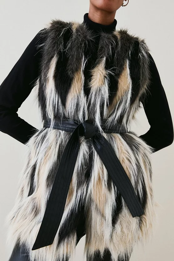 Faux Fur: 46% Acrylic, 39% Modacrylic, 15% Polyester. Lining: 100% Polyester. Remove belt before cleaning. Do Not Dry Clean. Model wears UK 8/US 4. Model height: 5″9. Length measurement: 80cm. d