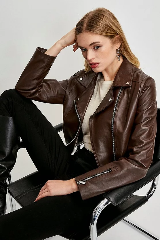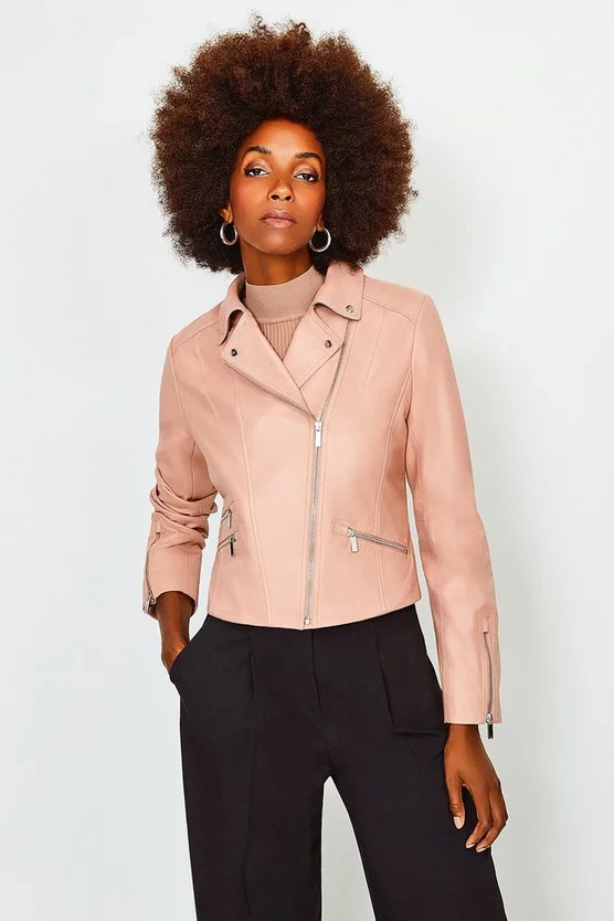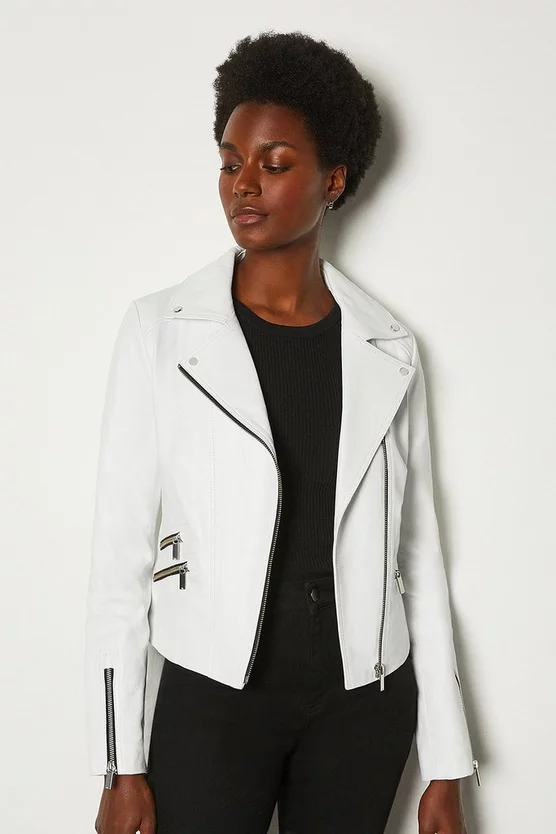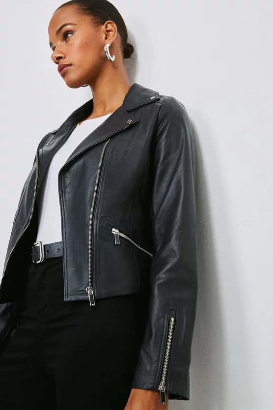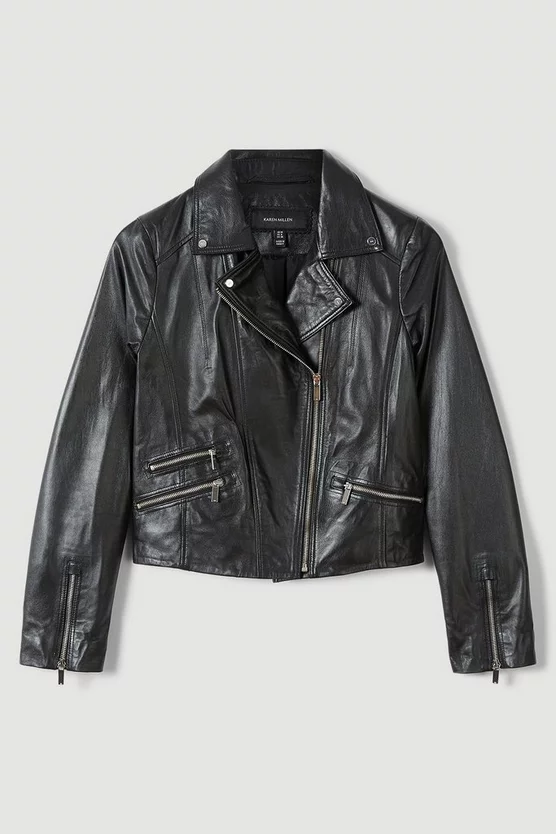 Boasting beautifully boxy proportions that promise to never drown your figure, our timeless leather jacket is a year-round must-have. Classic biker-style details like silver-tone zips and notched lapels perfectly encapsulate the timeless mood of a jacket that only gets better with age.