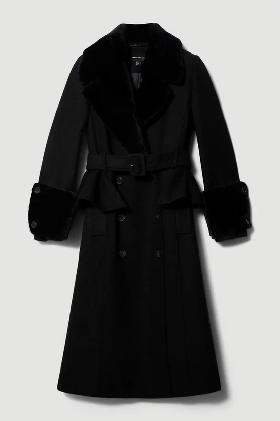 This luxurious coat combines the glamour of eras past with a contemporary perspective. Sheepskin shearling cuffs and lapels create an opulent mood, further emphasised by a premium Italian virgin wool blend. A buckle belt and flap details create a flattering hourglass effect, while double-breasted embossed buttons add the finishing touches.
