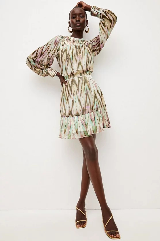 Exuding textural allure, this boldly printed mini dress marries a stylish metallic-flecked motif with Grecian-style metallic beading. It shows off semi-sheer sleeves with gathered cuffs, a cinched-in waist and swishy hemline. Perfect for summer styling, contrast the opulent beads with all-black accessories and statement gold jewellery.