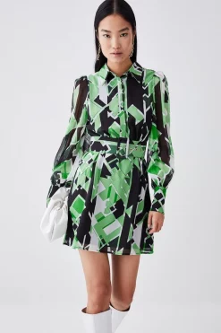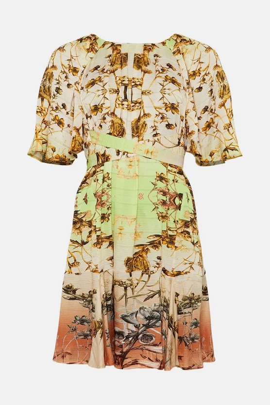 Equal parts elegant and feminine, this exquisitely crafted mini dress will look the part at summer gatherings and balmy weddings alike. From our collaboration with Rui Jiang, it blooms all over with a unique mirrored tulip print, reflecting her love of British flowers and inspired by the stems and petals she studies in her own home. Loose, fluttering sleeves are offset by a floaty skirt, cinched-in tie-detail waistline, and airy, ethereal feel. Leave hair loose and tousled to continue the romantic theme and complement the open back.