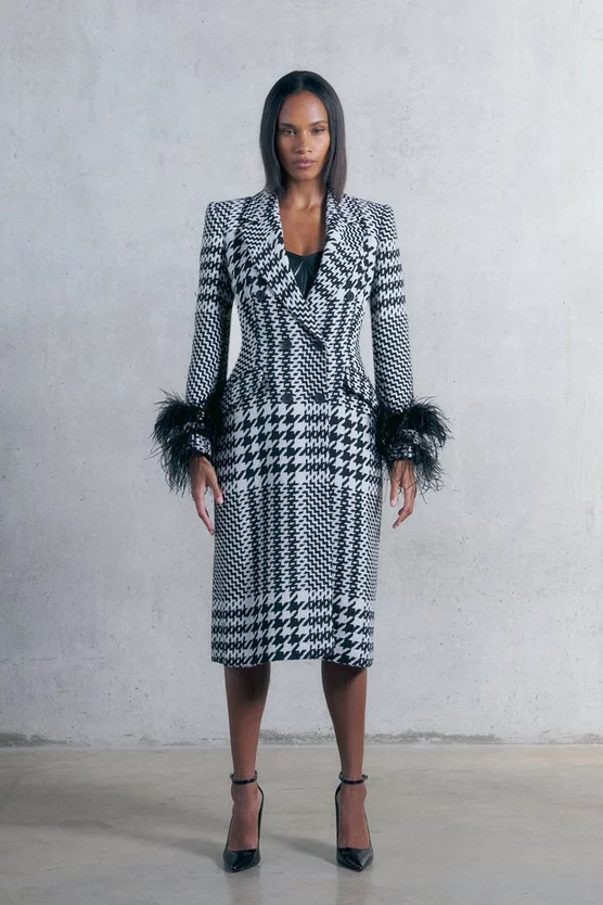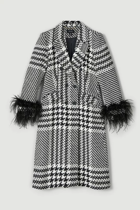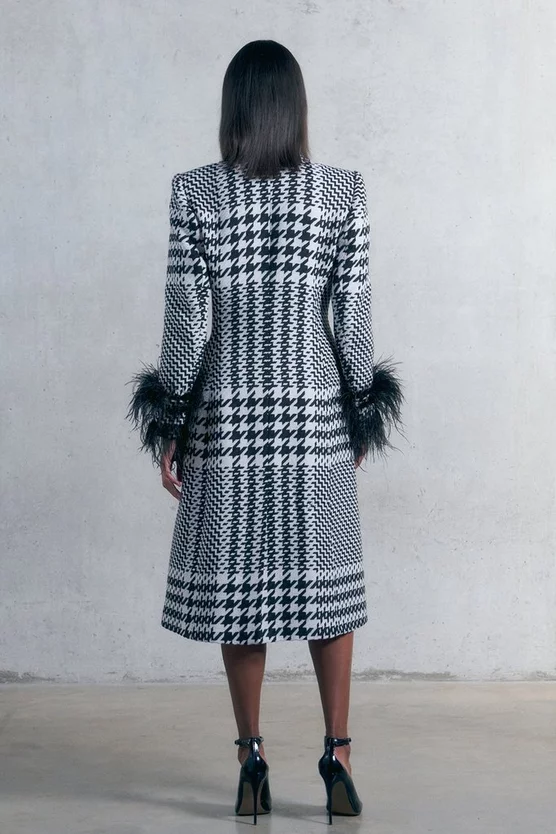 This fitted coat was designed for those who want to break boundaries but still enjoy a classic style. Crafted with a dogtooth check pattern for a traditional touch, the feather-trimmed cuffs of this coat truly bring the design to life.