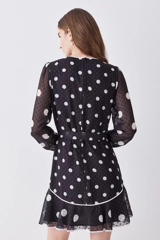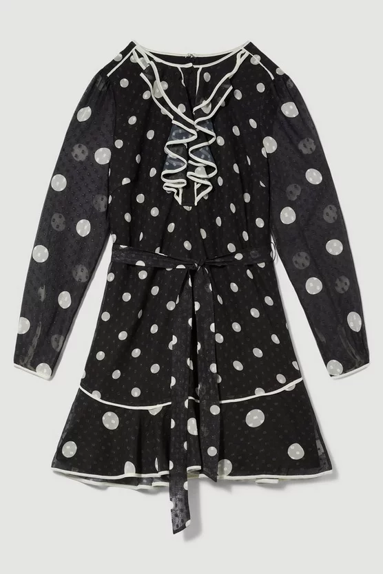 Featuring a classic polka dot print and georgette-style ruffle detailing, this monochrome mini dress can be styled for multiples occasions and seasons.