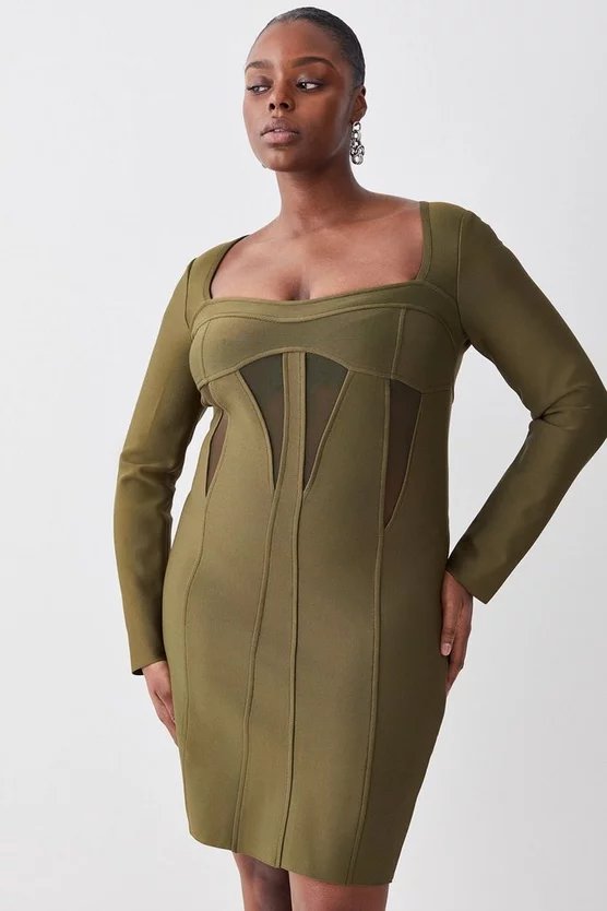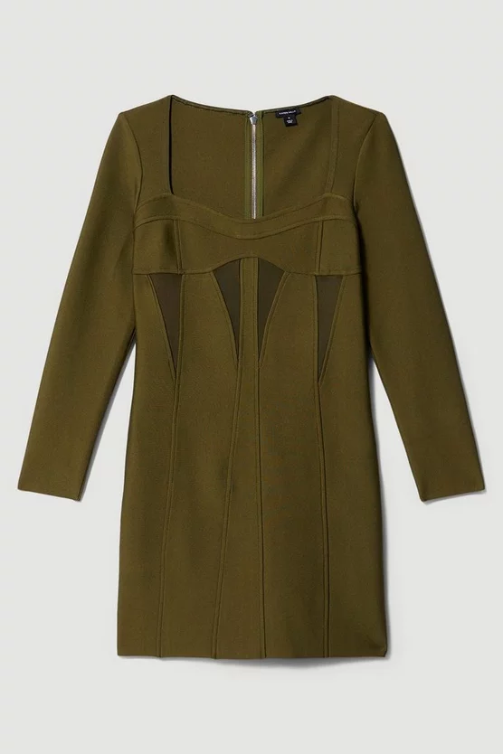 Fusing bandage detailing with mesh cut-outs, this contemporary piece smoothing sculpts the form. A square neckline adds a sultry touch which complements the front mesh details. Style this dress with stiletto heels for an after-dark look.