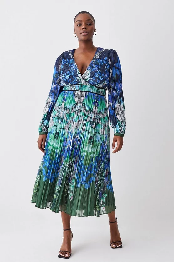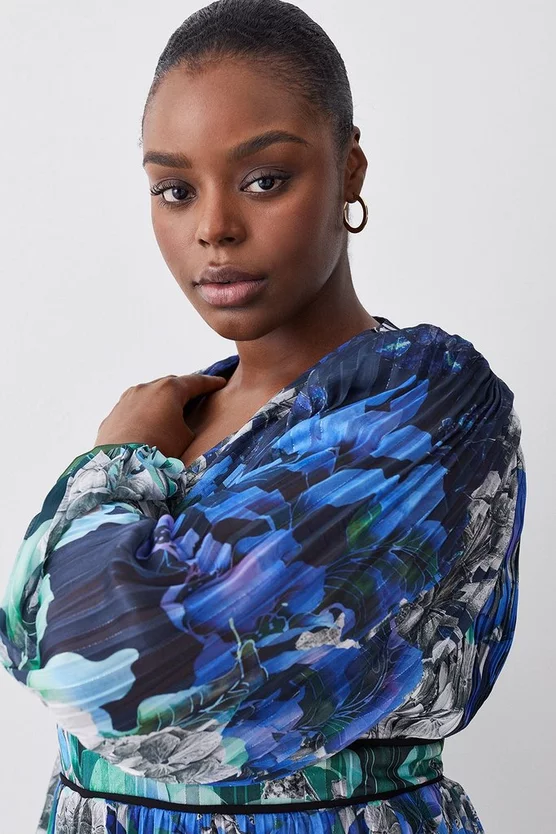 Promo 👏 Karen Millen Plus Size Mirrored Ombre Floral Pleat Drama Woven Mini 👗 Dress – blue 👏