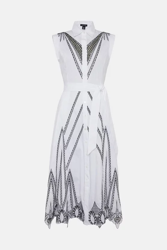 Modern romance comes calling with this beautiful embroidered dress. Cut from crisp cotton poplin and featuring neat cap sleeves, a pointed collar and waist-cinching belt, it makes a style-savvy choice for balmy summer occasions. Artisanal detailing comes in the form of intricate cutwork trims bordering the yoke, sleeves and skirt.