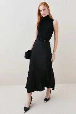 Elegantly combining two parts โ a slinky ribbed roll-neck top and flowing satin midi skirt โ this modern dress was made for minimalists. It features a utility-style buckled belt to cinch in your silhouette, complementing the understated sleeveless cut and demure, calf-skimming hemline.