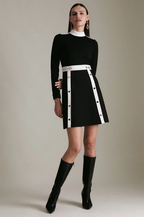 At once both preppy and polished, this neat colour-block dress shows off heritage--style snaffle trims and two rows of glossy gold-tone buttons. Its flattering high-necked fit and flared skirt show off every figure perfectly.