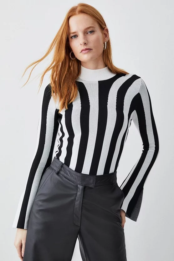 Characterised by a bold monochrome stripe print, this top will fit seamlessly into your capsule wardrobe. Crafted from knitted jacquard material, this long-sleeved top comfortably hugs the form, while fluted cuffs add a feminine touch.
