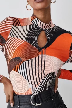 Best Sale ✨ Karen Millen Printed Long Sleeve Viscose Blend Keyhole Cut Out Jersey Top 🎉